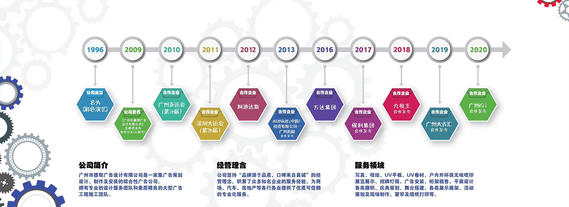 廣州市德幫廣告設(shè)計(jì)有限公司,是一家集廣告策劃 、設(shè)計(jì)及制作安裝于一體的綜合性廣告服務(wù)商,公司(原彩色演藝噴繪)成立于1996年,公司擁有惠普、愛(ài)普生戶(hù)內(nèi)外寫(xiě)真噴繪機(jī)20臺(tái),HP latex環(huán)保乳膠墨水打印機(jī)2臺(tái),大噴機(jī)10臺(tái),UV平板卷材機(jī)6臺(tái),全自動(dòng)智能切割機(jī)4臺(tái)等高端設(shè)備,專(zhuān)業(yè)的設(shè)計(jì)制作團(tuán)隊(duì)和素質(zhì)精良的大型廣告工程施工團(tuán)隊(duì),廠(chǎng)房面積達(dá)3000平米。公司主要經(jīng)營(yíng)戶(hù)內(nèi)、外寫(xiě)真、噴繪、廣告工程的制作、平面設(shè)計(jì)、燈箱、招牌等業(yè)務(wù),公司所有的設(shè)備采用進(jìn)口設(shè)備、后期制作自動(dòng)化,生產(chǎn)速度快、質(zhì)量第一。與方圓地產(chǎn)、萬(wàn)達(dá)廣場(chǎng)、招商地產(chǎn)、萬(wàn)科地產(chǎn)合作,主要制作內(nèi)容:廣告活動(dòng)物料、圍墻的生產(chǎn)、安裝、桁架的搭建、活動(dòng)執(zhí)行、高空安裝、燈旗的制作及安裝等業(yè)務(wù)。公司先后榮獲廣州地區(qū)十佳廣告工程制作公司、中國(guó)商務(wù)廣告協(xié)會(huì)廣告工程分會(huì)會(huì)員單位、全國(guó)噴繪企業(yè)入圍品牌公司等諸多榮譽(yù)。至今已發(fā)展成為華南地區(qū)大型的廣告產(chǎn)品供應(yīng)基地。并以“產(chǎn)量高、質(zhì)量好、交貨快”的經(jīng)營(yíng)模式贏(yíng)得了廣大客戶(hù)的稱(chēng)贊。并堅(jiān)持“品牌源于品質(zhì),口碑來(lái)自真誠(chéng)”的經(jīng)營(yíng)理念,積累了眾多知名企業(yè)、政府機(jī)構(gòu)的服務(wù)經(jīng)驗(yàn),為大型活動(dòng)、商場(chǎng)超市、汽車(chē)、房地產(chǎn)等各行業(yè)提供了優(yōu)質(zhì)可靠的專(zhuān)業(yè)化廣告服務(wù)。旨在協(xié)助客戶(hù)提升品牌形象,并以建立長(zhǎng)期品牌價(jià)值為使命,讓各行業(yè)的品牌形象結(jié)合產(chǎn)品推向市場(chǎng),贏(yíng)得足夠的社會(huì)關(guān)注,幫助企業(yè)品牌成長(zhǎng)。